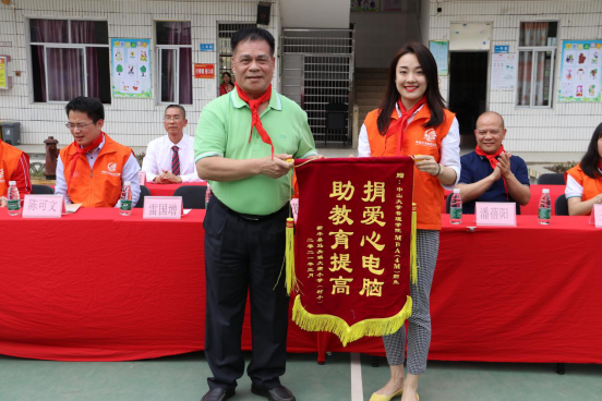 廣東省教育基金會雷國增副秘書長向中山大學管理學院MBA聯(lián)合會贈送錦旗,中山大學管理學院MBA聯(lián)合會吳璇副主席接收錦旗。